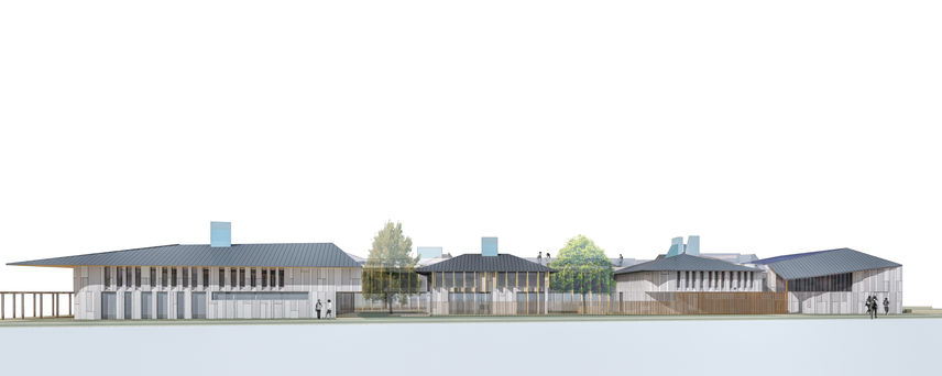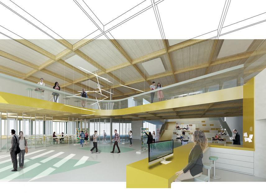 La scuola si propone come organismo aperto: da un impianto a cortile simi-chiuso (del masterplan) si passa a un sistema lineare aperto e permeabile, meglio disposto alla luce, alla ventilazione e alle vedute profonde, nel pieno rispetto delle condizioni d’insieme e delle relazioni precostituite (secondo i tracciati della centuriazione dei campi). Gli spazi specialistici principali si concentrano nelle due testate: aula magna, mensa e spazi amministrativi nella testata della piazza delle scuole e la palestra all’opposto sul piazzale dello sport, contribuendo a definire l’immagine di un’architettura molto articolata e scenografica. Si configurano due cortili pertinenziali nei tratti centrali: a nord-ovest quello più raccolto, attrezzato e rivolto alle attività delle prime classi (in continuità con la scuola primaria di fronte); a sud-est quello più ampio e connesso alle attività di fab-lab, alla mensa all’aperto e alla ricreazione comune; entrambi sono dotati di sistema di recinzione permeabile visivamente, integrato con l’architettura. L’immagine di arrivo alla scuola si contraddistingue con la presenza di un ampio e scenografico porticato di mediazione-accesso sul piazzale scolastico (estensione-inclusione dello spazio pubblico): consente la chiara individuazione degli ingressi (aula magna, scuola, mensa, amministrazione), con una piazza coperta sempre ospitale di raccoglimento (incontro, attività esterne, mensa....). S’individua la separazione degli ingressi esterni per la palestra (uno dei quali assistito da una tettoia ed un porticato): pubblico ed atleti possono accedere in due lati contrapposti, con percorsi d'indirizzo tracciati già dal piazzale dello sport e dai vialetti laterali all’edificio scolastico. Si evidenzia una particolare articolazione delle coperture: la parte più centrale è piana ed accessibile dalla scuola per attività all'aperto, assistite da due ambienti (mansarde, verande) laboratoriali pluriuso; oltre alla presenza di tratti non accessibili di tetto-verde e vasconi per coltivazioni vegetali; le falde inclinate proteggono e separano allo stesso tempo questi importanti spazi d’uso “panoramici”. Il sistema delle coperture è notevolmente permeabile alla luce e alla ventilazione naturali: tutte le aule ed i laboratori del primo piano possiedono una finestra alta, di riscontro e di collegamento visivo tra il piano d'uso del tetto e quelli interni, oltre a grandi lucernari-camini per assistere le parti comuni centrali dei cluster. L'articolazione delle coperture ricalca la composizione in 7 cluster dell'organismo scolastico, dominati da altrettanti grandi camini solari: portano luce naturale anche negli spazi comuni al piano terra (con una teca di vetro passante) ed estraggono una parte d'aria da tutti i 10 ambienti serviti, i servizi igienici della palestra o l’aula magna (utile soprattutto nel periodo serale per “scaricare” termicamente l’edificio). Le parti di coperture non praticabili (più della metà) sono previste con falde inclinate a padiglioni semiaperti e quelle meglio esposte (sud-est e sud-ovest) rivestite con pannelli fotovoltaici cristallini (palestra) ed amorfi (più efficienti in assenza di sole, più ecosostenibili) integrati nei manti di impermeabilizzazione in lamiera di tonalità scura; le altezze dei colmi di circa 150cm, assieme ai parapetti trasparenti di uguale altezza, proteggono efficacemente gli spazi d’uso. I solai di copertura hanno sporgenze variabili sulle facciate, dipendenti dal tipo di orientamento solare: assente a nord-est e nord-ovest e molto accentuato invece a sud-est e sud-ovest, cui si associano a volte frangisole verticali come loro naturale estensione in facciata per completare la schermature di queste. Il taglio verticale ed incavato delle finestrature nelle pareti piene e la presenza di profondi frangisole verticali nelle ampie vetrate (degli affaccia rivolti verso sud) assicurano un'adeguata schermatura rispetto dannosi soleggiamenti, integrando questa tematica nel disegno architettonico d’insieme.